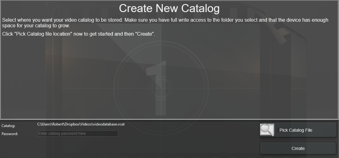 Click the Pick Catalog File button to choose a folder location and name your new video catalog. The default name is videodatabase.vcat.