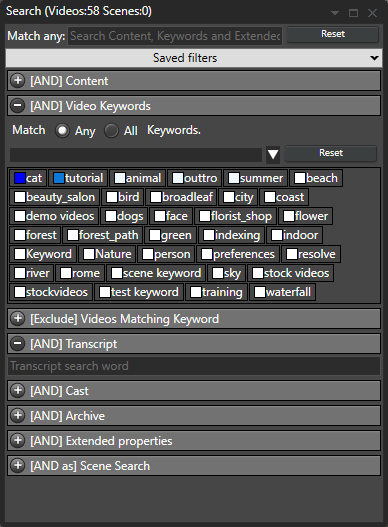 Using multiple filters, such as Content AND Video Keywords, helps make the filter narrower, so you can be more precise. Too narrow, of course, and you may not get anything!