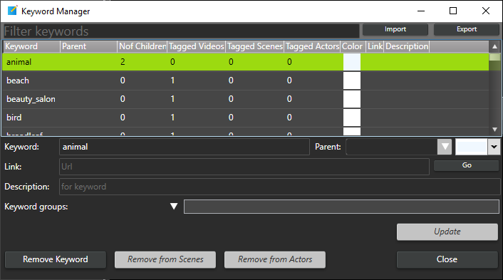 You can also remove keywords with the "Remove from videos", "Remove from scenes", and "Remove from Actors" buttons.