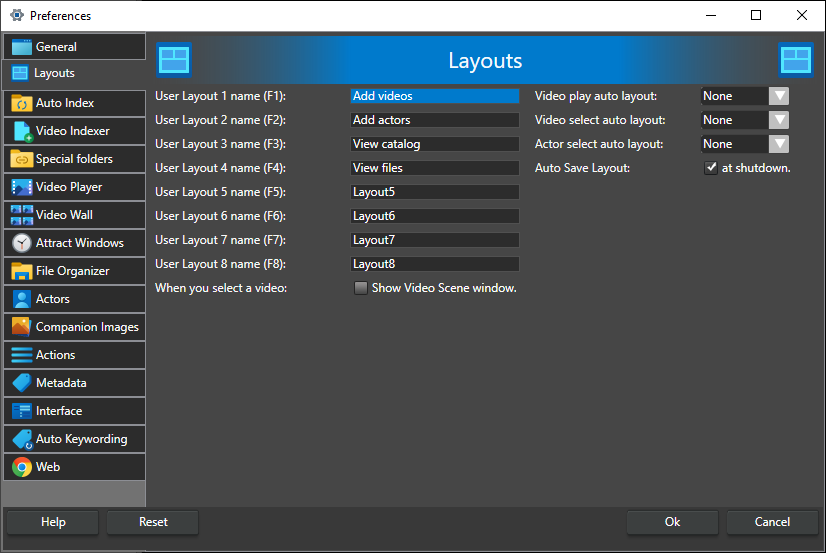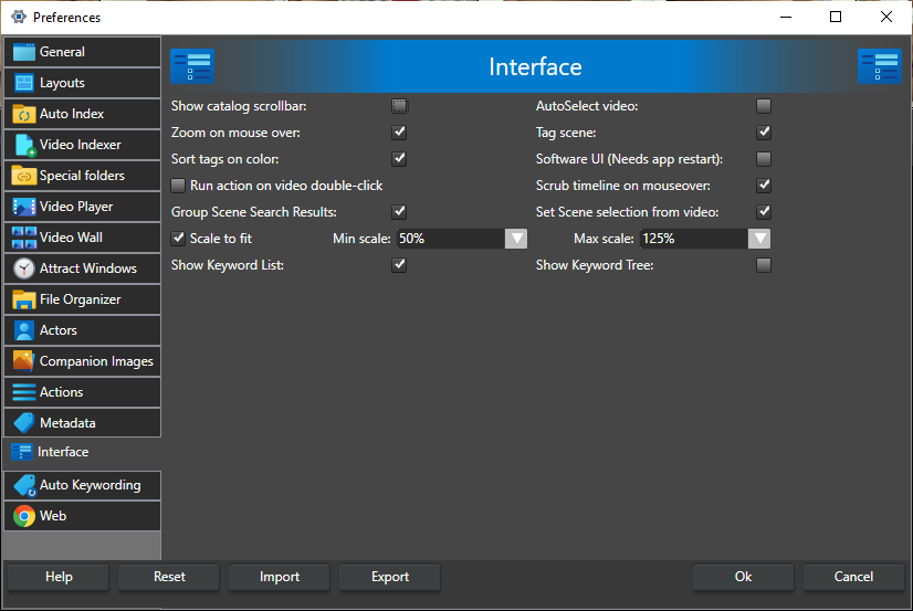 Clicking a scene thumbnail will start playing from that scene in the Video Player. Right mouse button, click on a scene thumbnail shows a menu for using the image as either the preview thumbnail for the whole video or as a cast thumbnail for an actor. You can remove thumbnails you don\'t want in the Video Scene window via the right-click menu.