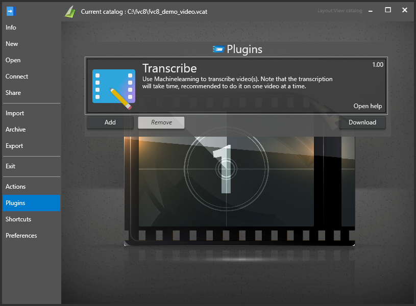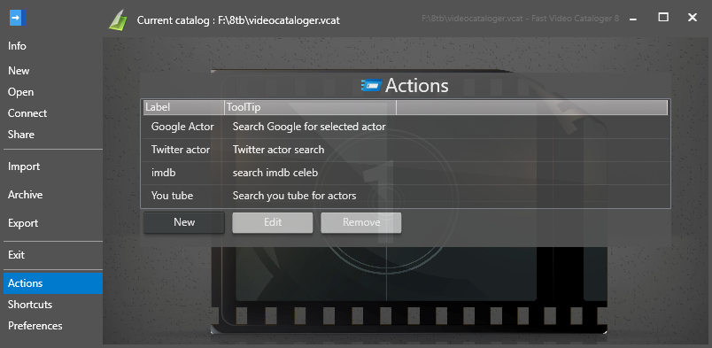 Fast video cataloger can be started with command line arguments. If an instance of fast video cataloger is running and you start a new instance with arguments, these arguments will be passed to the running instance.