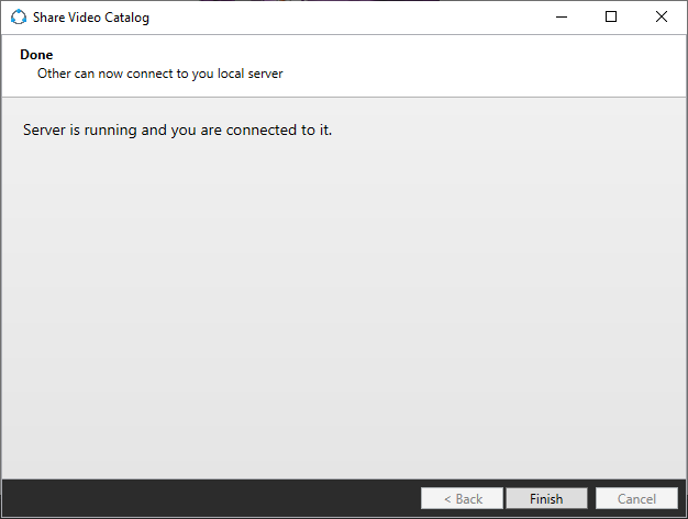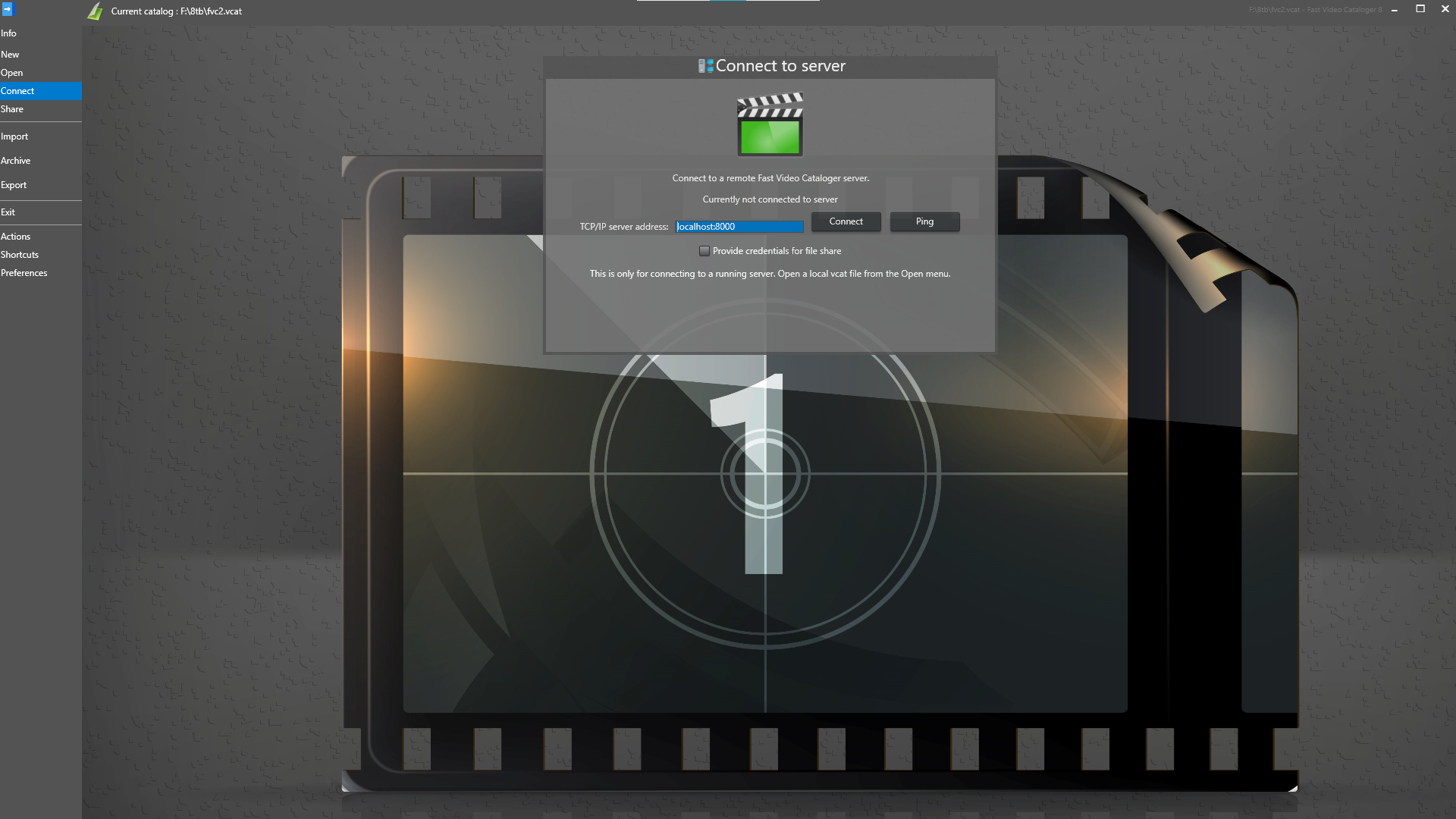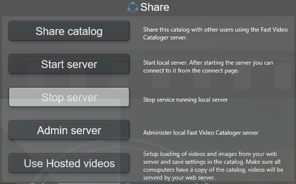 You connect to a running Fast video cataloger server from the connect page. A server is started, stopped, and managed from the Share page.