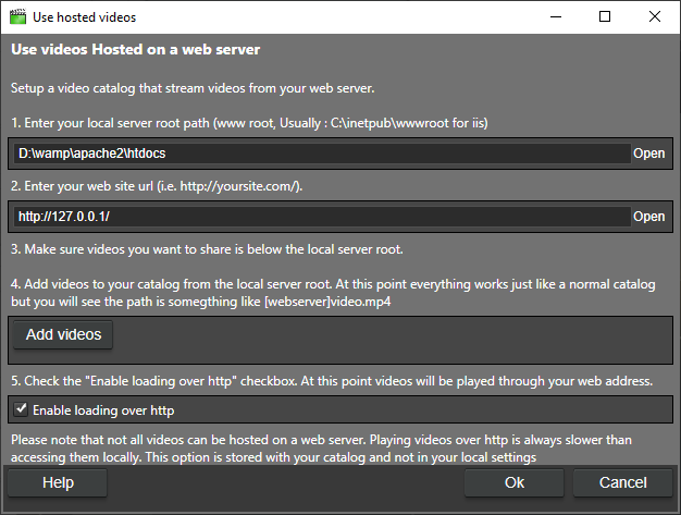 If you can connect from another computer but files, do not play over the HTTP server. Are files in supported formats? Old video formats will not work over HTTP? Can you connect to the webserver from a web browser? Can you access the video directly if you enter the URL in a web browser?