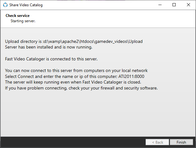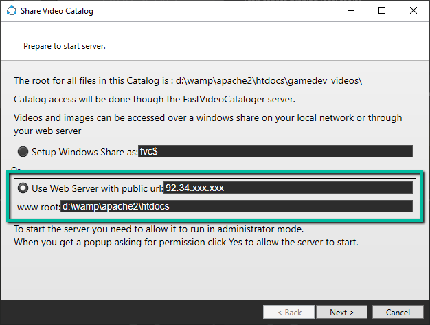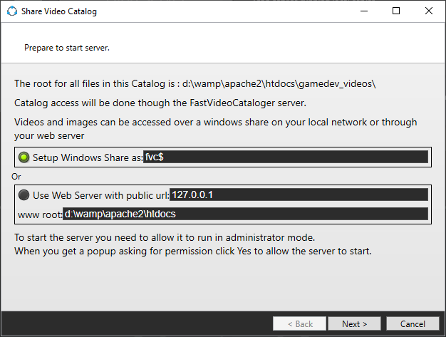 All video metadata is server from the Fast video cataloger server. The video files can be played over a web server or a Window share in a local network. If your server machine is set up to require login credentials to access the share, you can provide them by checking the credentials checkbox and entering the user and password you want to connect to the share. Note that is it possible to connect to the Fast video cataloger server while failing the credentials. The credentials are only used for playing videos and viewing companion images.