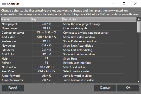 You can change these shortcuts from the shortcut window and assign shortcuts to some actions that do not have defaults. You can also assign shortcuts to your custom actions.